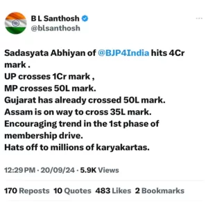 बता दें, BJP के राष्ट्रीय संगठन महामंत्री बीएल संतोष ने X पर ट्वीट कर राष्ट्रीय सदस्यता अभियान के आंकड़े साझा किए हैं। जारी आंकड़ों के मुताबिक, बीजेपी देशभर में अब तक 4 करोड़ सदस्य बना चुकी है। इनमें उप्र एक करोड़ सदस्य बनाकर पहले नंबर पर है। एमपी और गुजरात में 50-50 लाख सदस्य बने हैं। असम में 35 लाख सदस्य बने हैं। बीएल संतोष ने ये आंकड़े जारी कर बीजेपी कार्यकर्ताओं को बधाई दी है। बता दें, बीजेपी ने इस राष्ट्रीय सदस्यता अभियान के जरिए पार्टी से 10 करोड़ नए सदस्य जोड़ने का लक्ष्य रखा है।