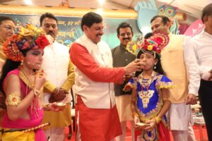 मुख्यमंत्री मोहन यादव रविवार को इंदौर पहुंचे। जहां वे शहर में आयोजित श्रीकृष्ण जन्माष्टमी महोत्सव में शामिल हुए। इस दौरान उन्होंने बालकृष्ण के रूप में पधारे बालकों पर पुष्प वर्षा की. मुख्यमंत्री ने दही हांडी फोड़ कार्यक्रम से पहले बालकृष्ण को माखन खिलाया. सीएम ने यहाँ भगवान कृष्ण की प्रतिमा के सामने बांसुरी भेंट की। इस अवसर पर उन्होंने ‘गोविंदा आला रे आला’ गीत भी गुनगुनाया.